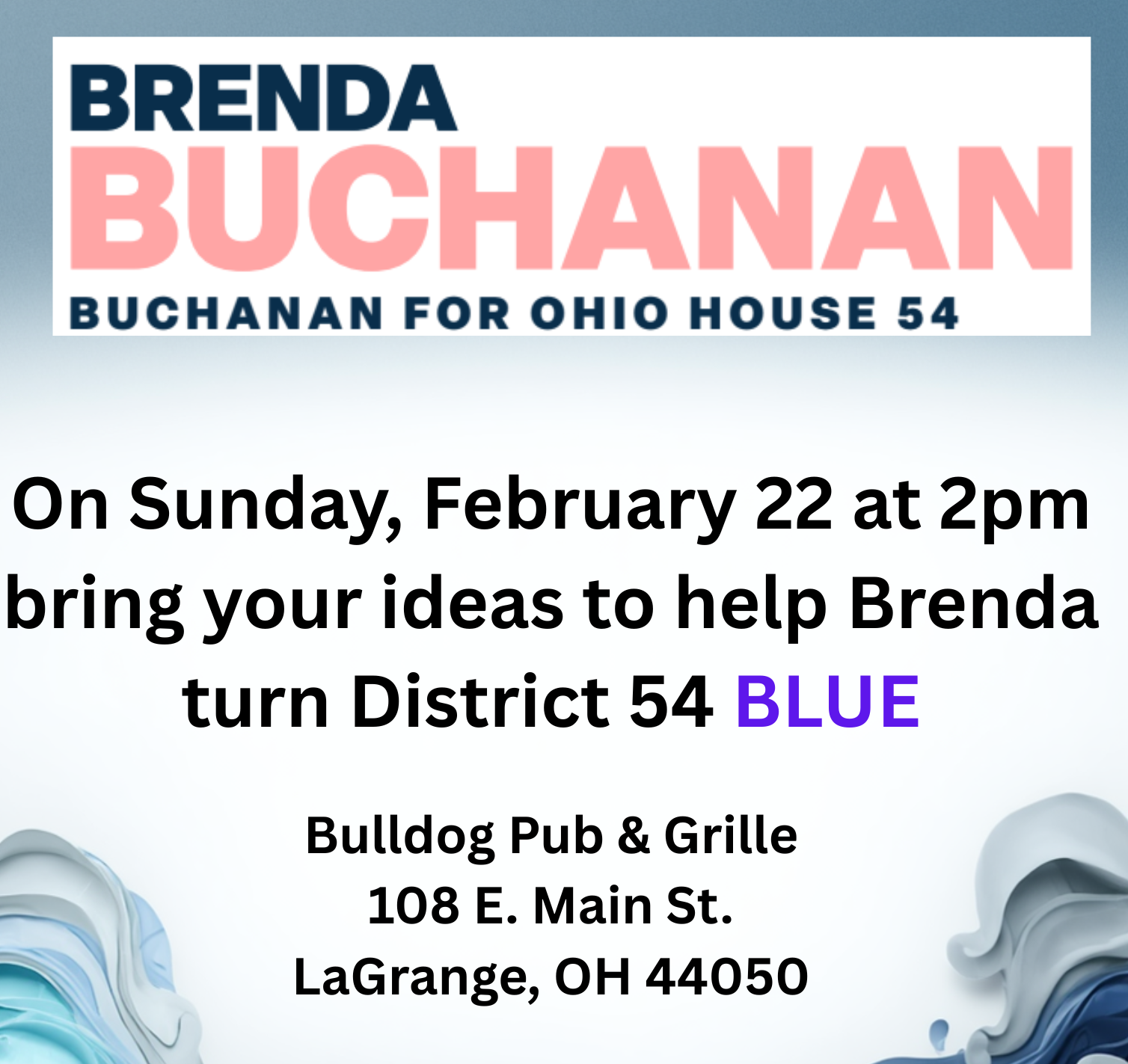 LCRD Member, Brenda Buchanan, is a candidate in the race for Representative in Ohio House District 54. Meet with Brenda on February 22nd at the Bulldog Pub & Grille in LaGrange.